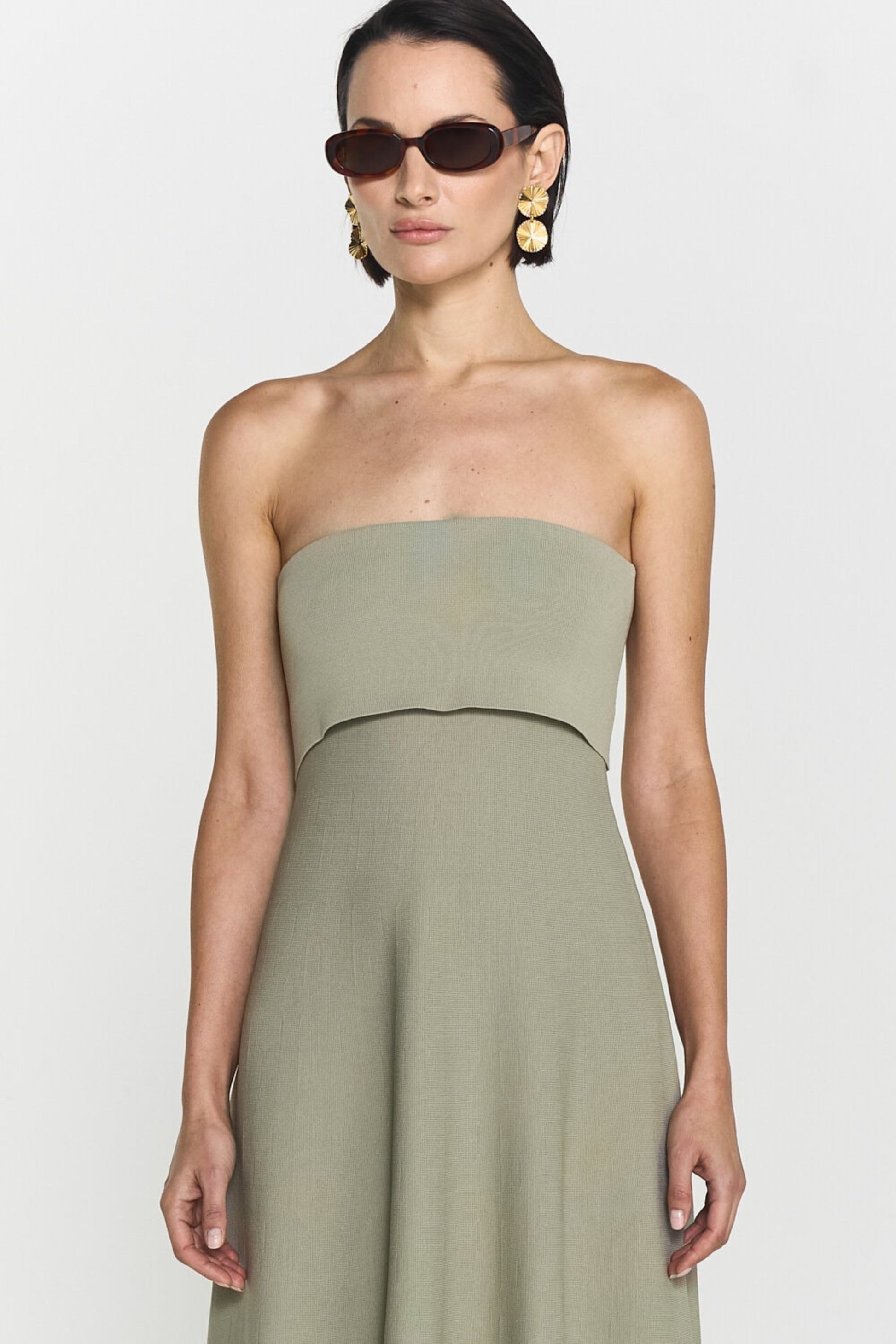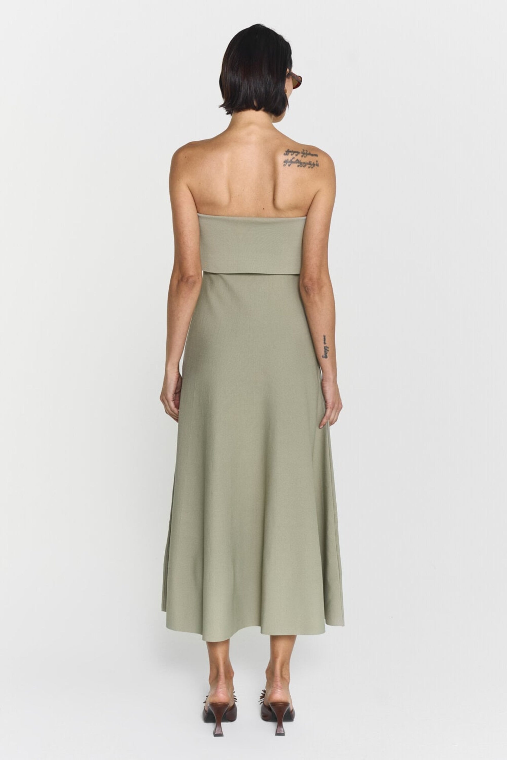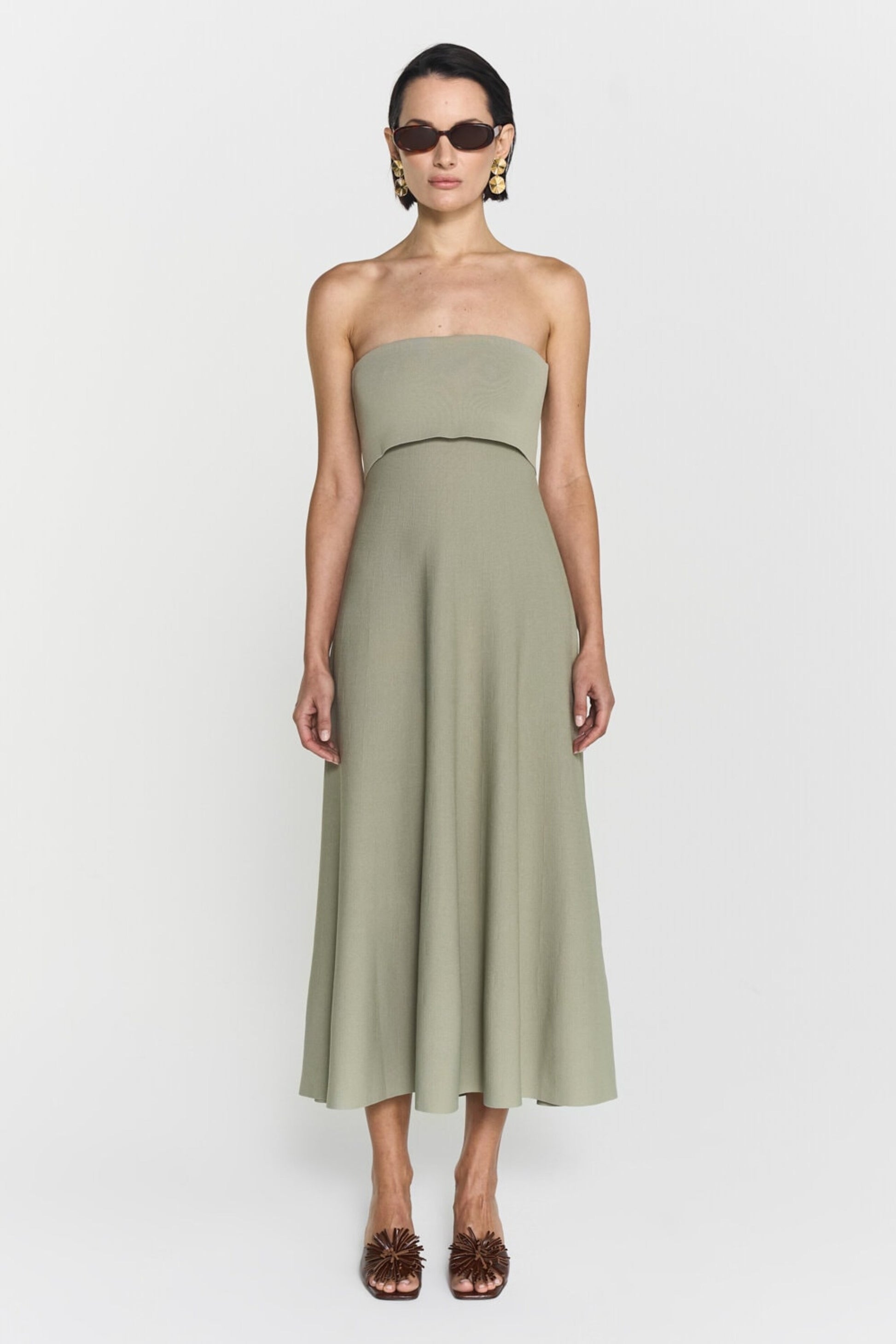 Clementina-klänningen, detta axelbandslösa mästerverk har en vikt detalj på bysten, vilket skapar en fantastisk siluett. Har en halkfri silikonbindning på insidan av bysten. Tillverkad av stickat viskostyg, flyter den elegant i en A-linje design med en midi-längd. Observera att längden kan öka något när du bär. För att uppnå en ännu längre längd rekommenderar vi att du ångar plagget medan det hänger.