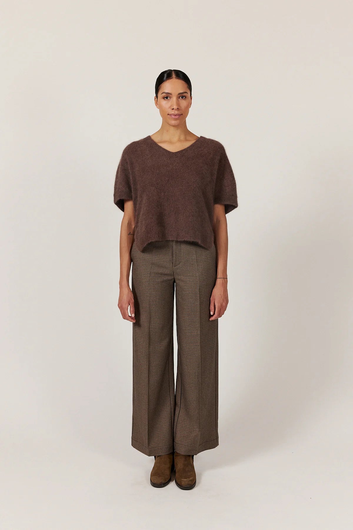 Dana är en stickad tröja i 100 % ultramjuk tvättbjörnsull med sömlöst böljande kropp och ärmar för en elegant och avslappnad passform. En ribbad V-ringning, korta ärmar och ribbad nederkant ger en subtil struktur till den mjuka silhuetten.