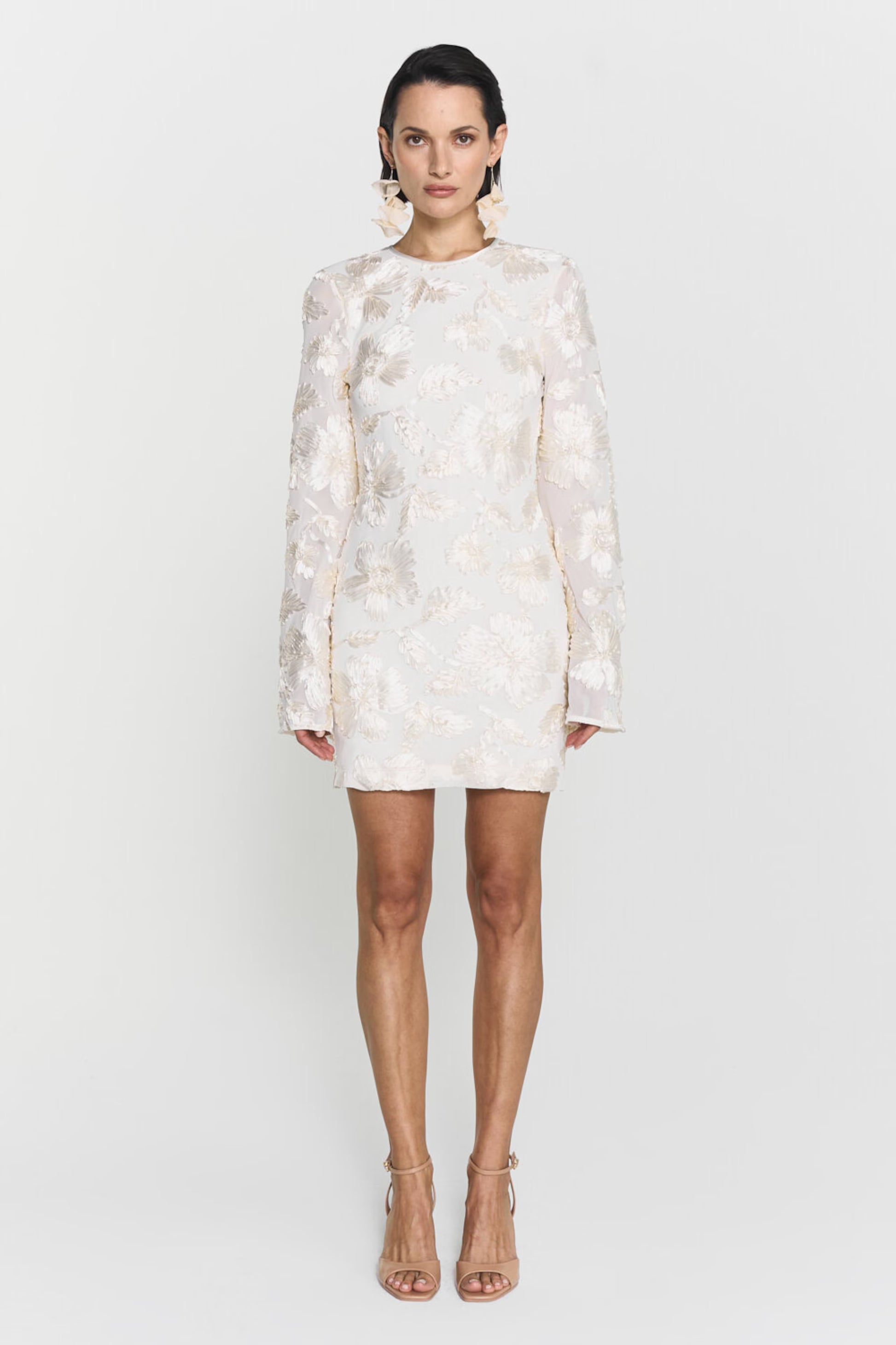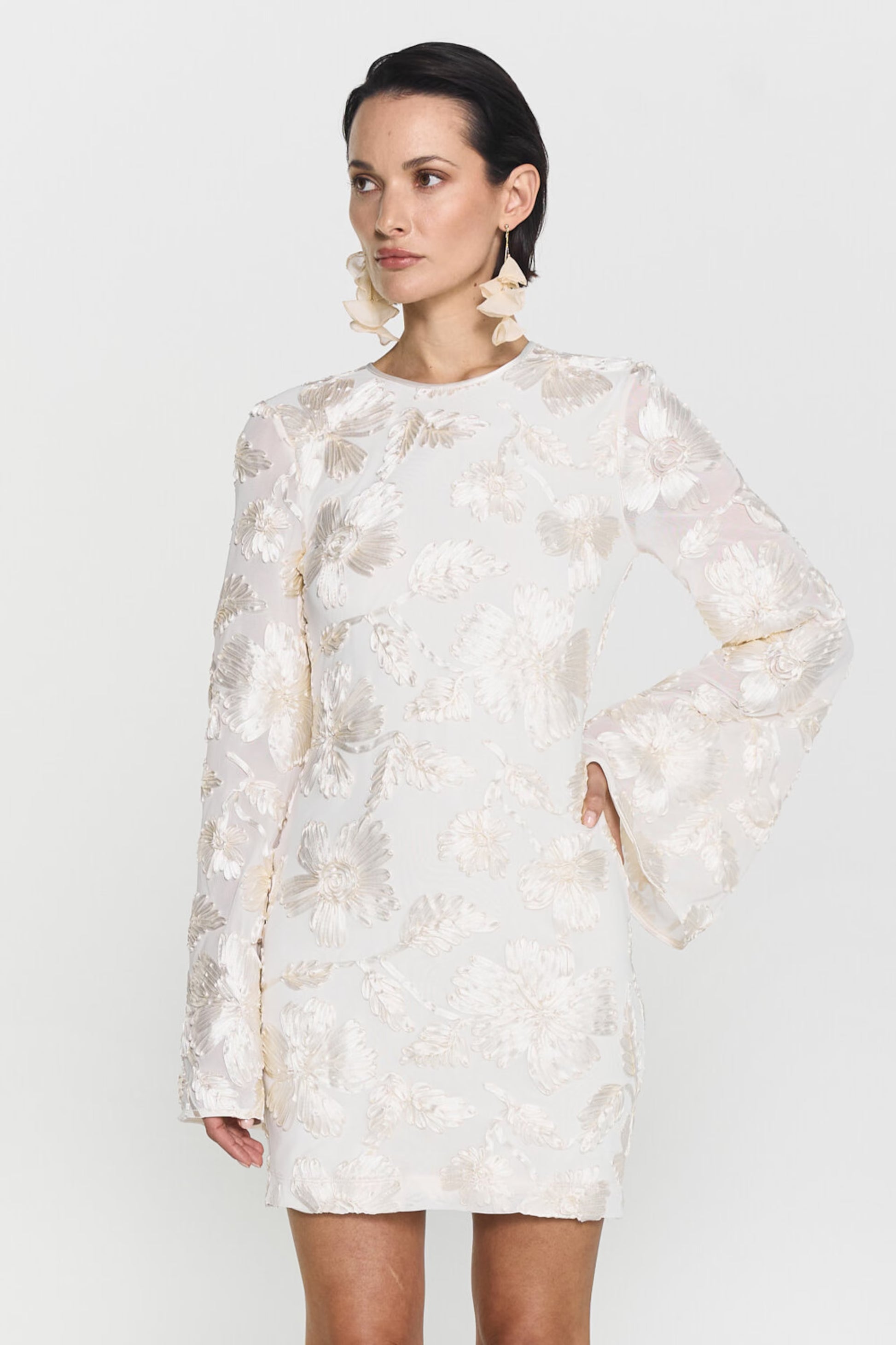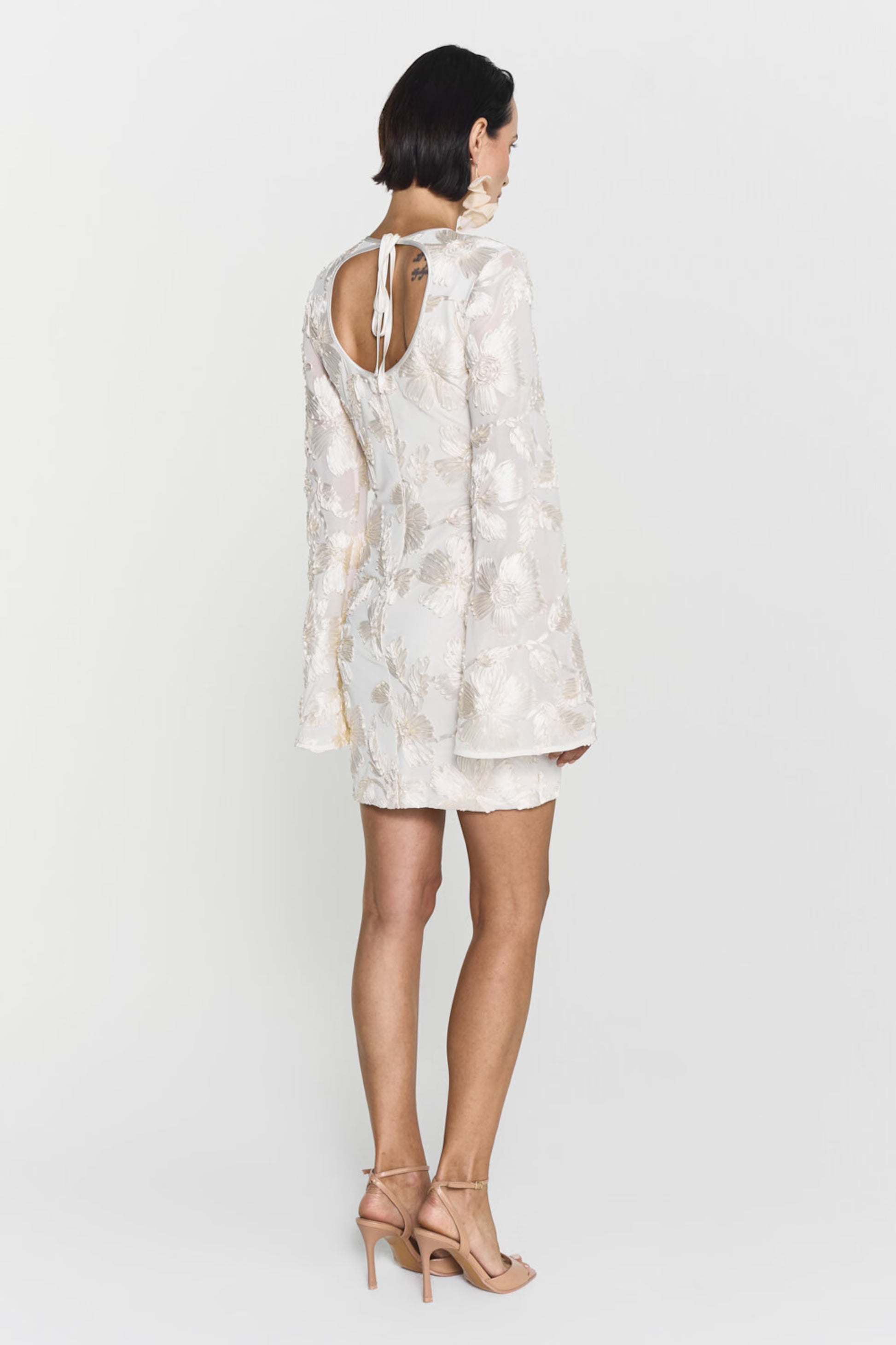 Vår Freesia-klänning, en vision av elegans. Denna förtrollande klänning är prydd med fina blomdetaljer och har en lockande öppen rygg, stängd med en dold dragkedja och justerbar.