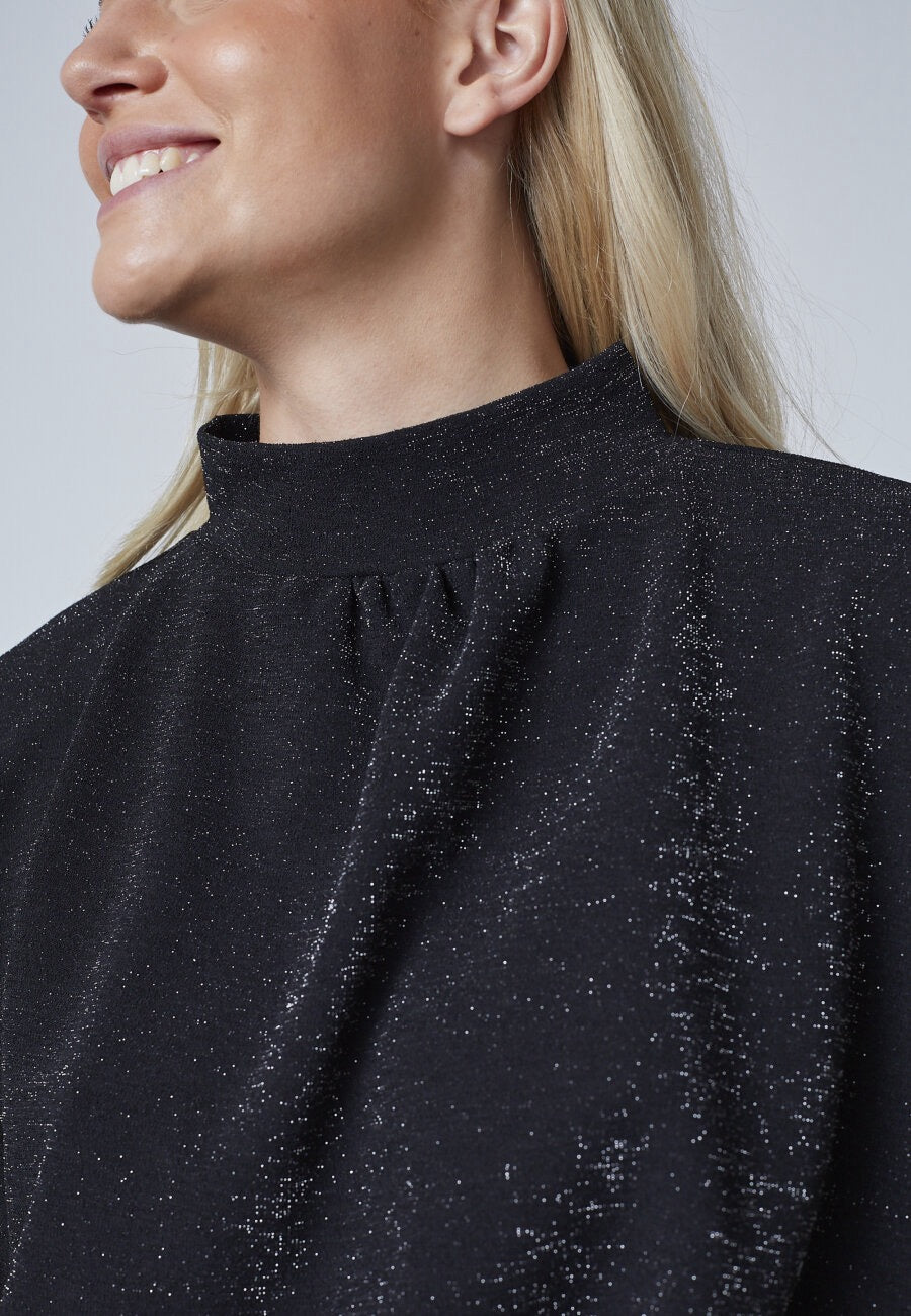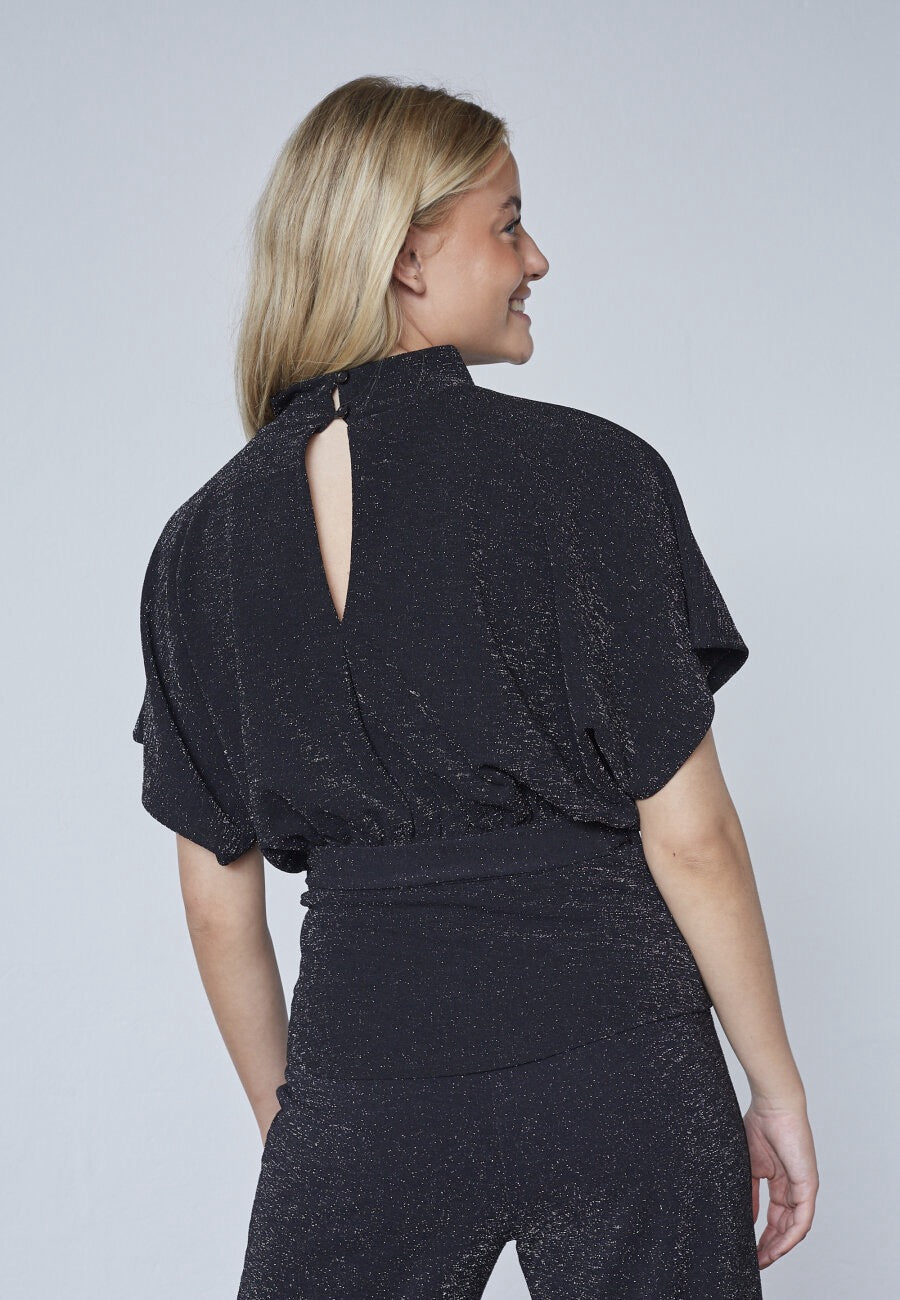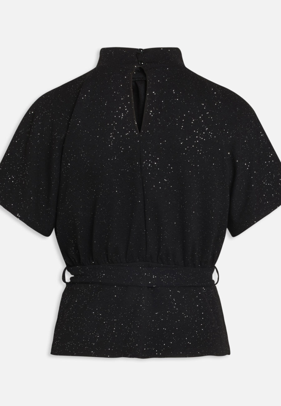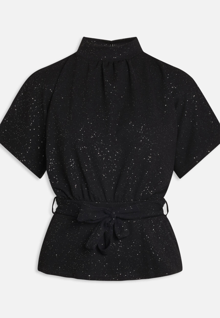 Fest topp med en lätt hög hals och korta, fladdermusliknande ärmar. Toppen har en lös passform upptill och ett medföljande knytband i midjan som framhäver figuren.