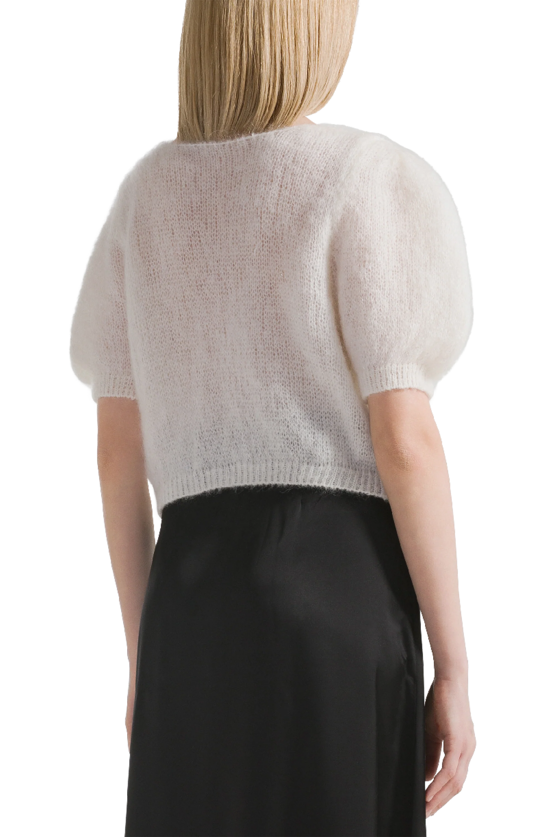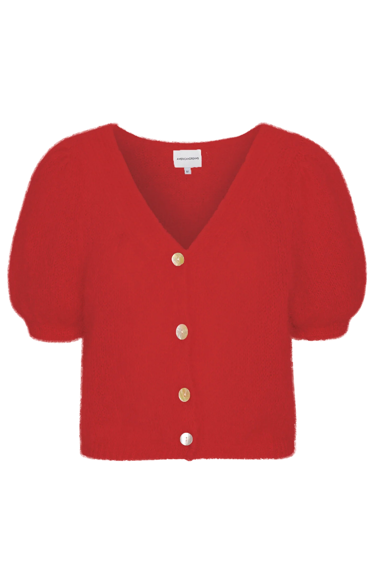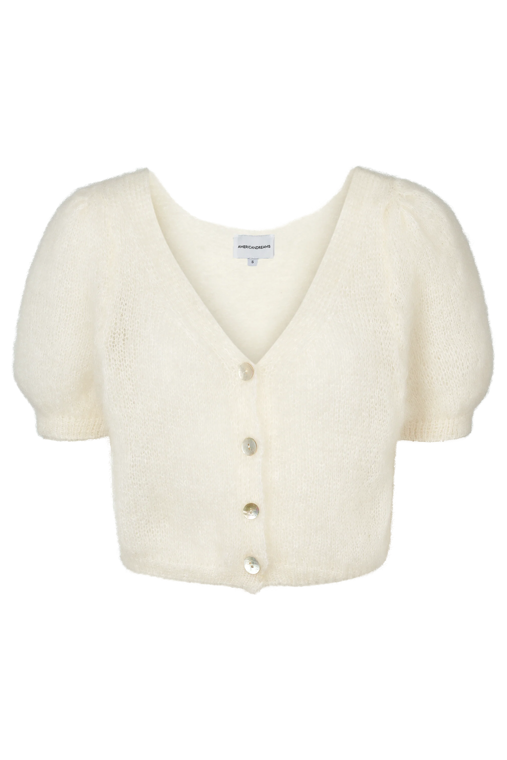 En beskuren stickad kofta med knappknäppning och V-ringning som framhäver de fina linjerna i halsringningen och nyckelbenen kommer att ge en feminin touch till dina dagliga klädsel. Koftan är inspirerad av vår signaturkofta Cornelia, tillverkad i en kortärmad version, speciellt lämpad för vår och sommar.