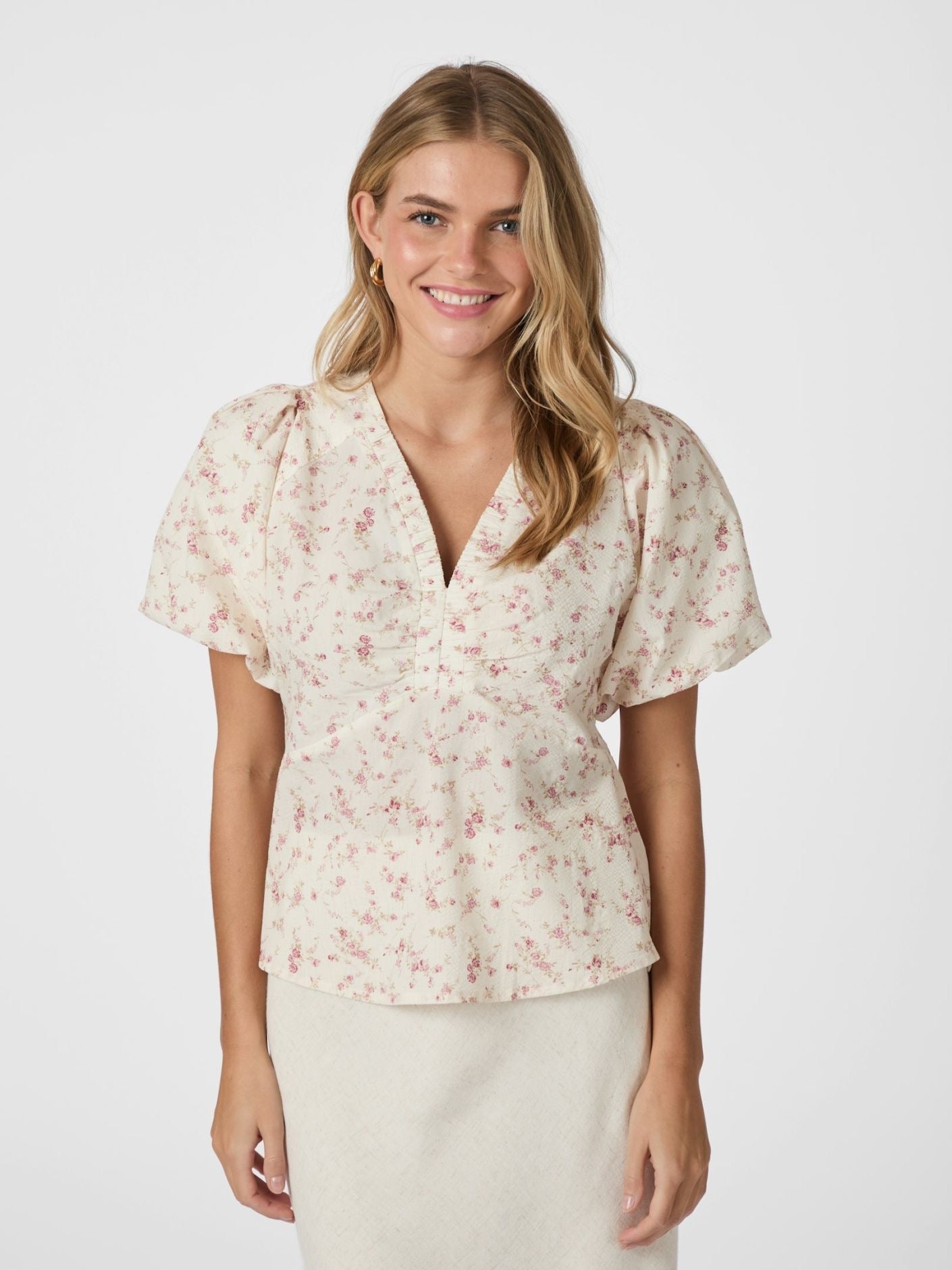 Blus i bomullskvalitet med en söt tryck, ärmar som slutar över armbågen och dold dragkedja. Modellen är 176 cm lång och bär storlek 36.
