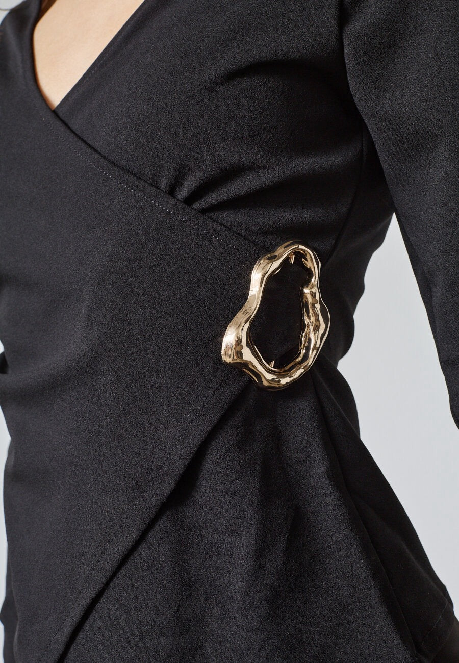 KEVELA-TOP är en långärmad blus med omlottdesign och v-ringning. Den har en asymmetrisk linje som fästs med ett stort, abstrakt spänne.
