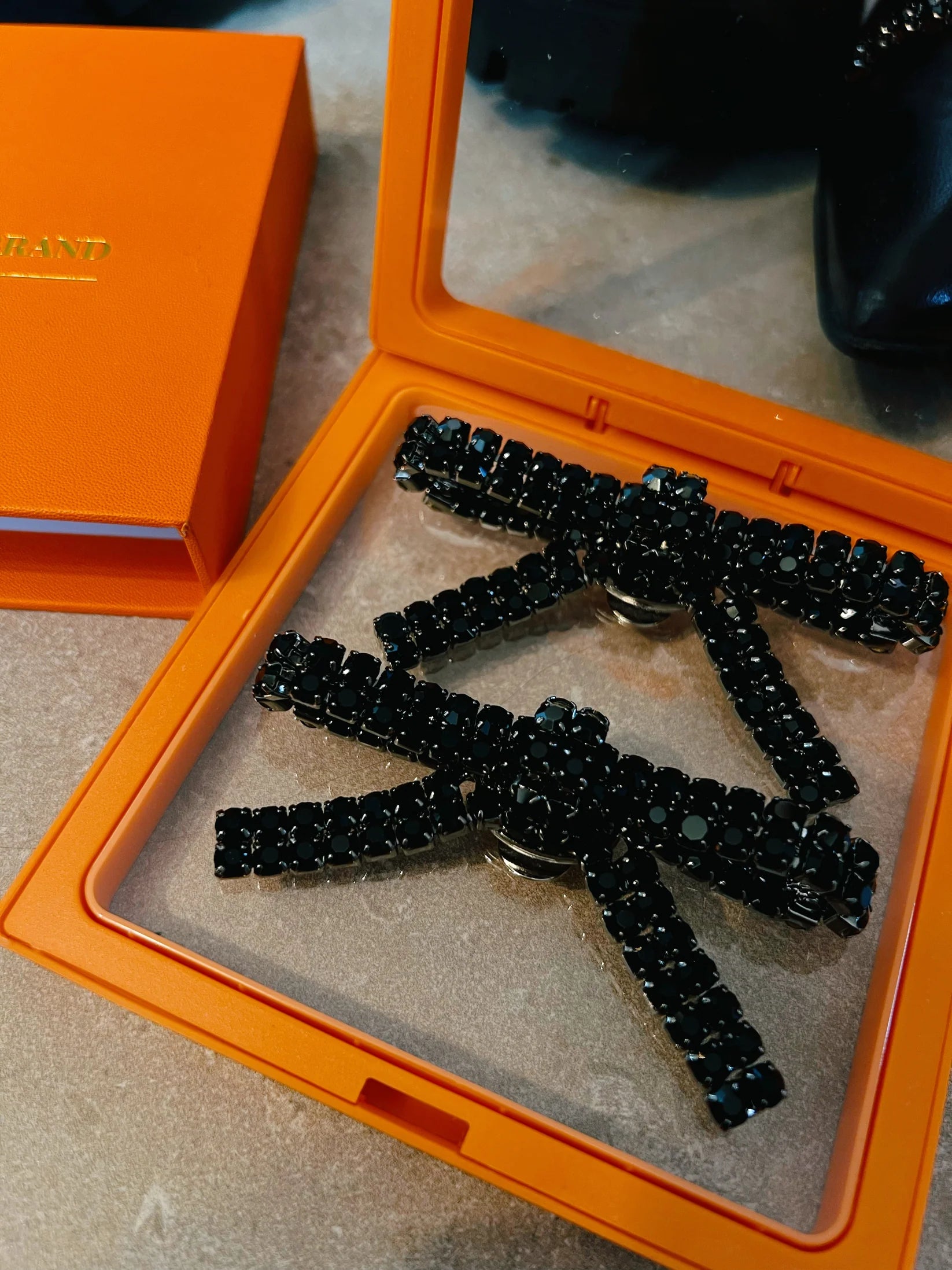 En glittrande och elegant svart kristallrosett som direkt förvandlar dina skor till något alldeles extra. På baksidan sitter två smidiga skoklipps-spännen som enkelt nyper fast skosmycket på pumps, loafers, sandaler, sneakers – eller varför inte på väskremmen för en unik accessoar?