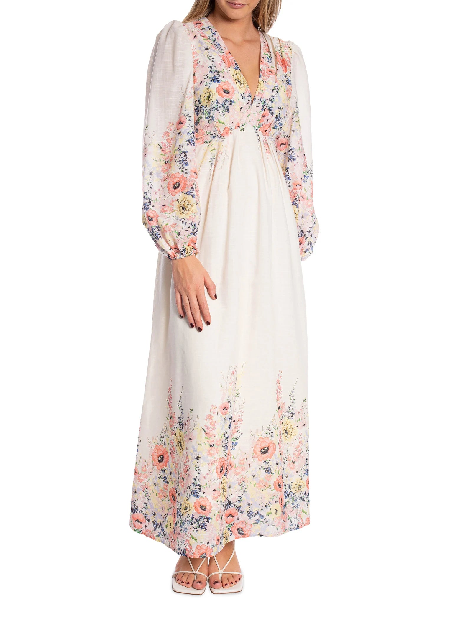 Klänning Silfi från Neo Noir. En vacker romantisk klänning med vackert blomprint. Lång ärm, fullängd och smickrande markering i midja samt v-ringning. Bär med ett par sandaler eller en klack beroende på tillfälle!