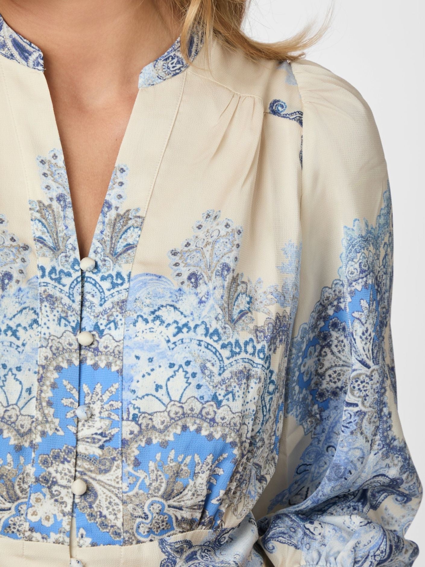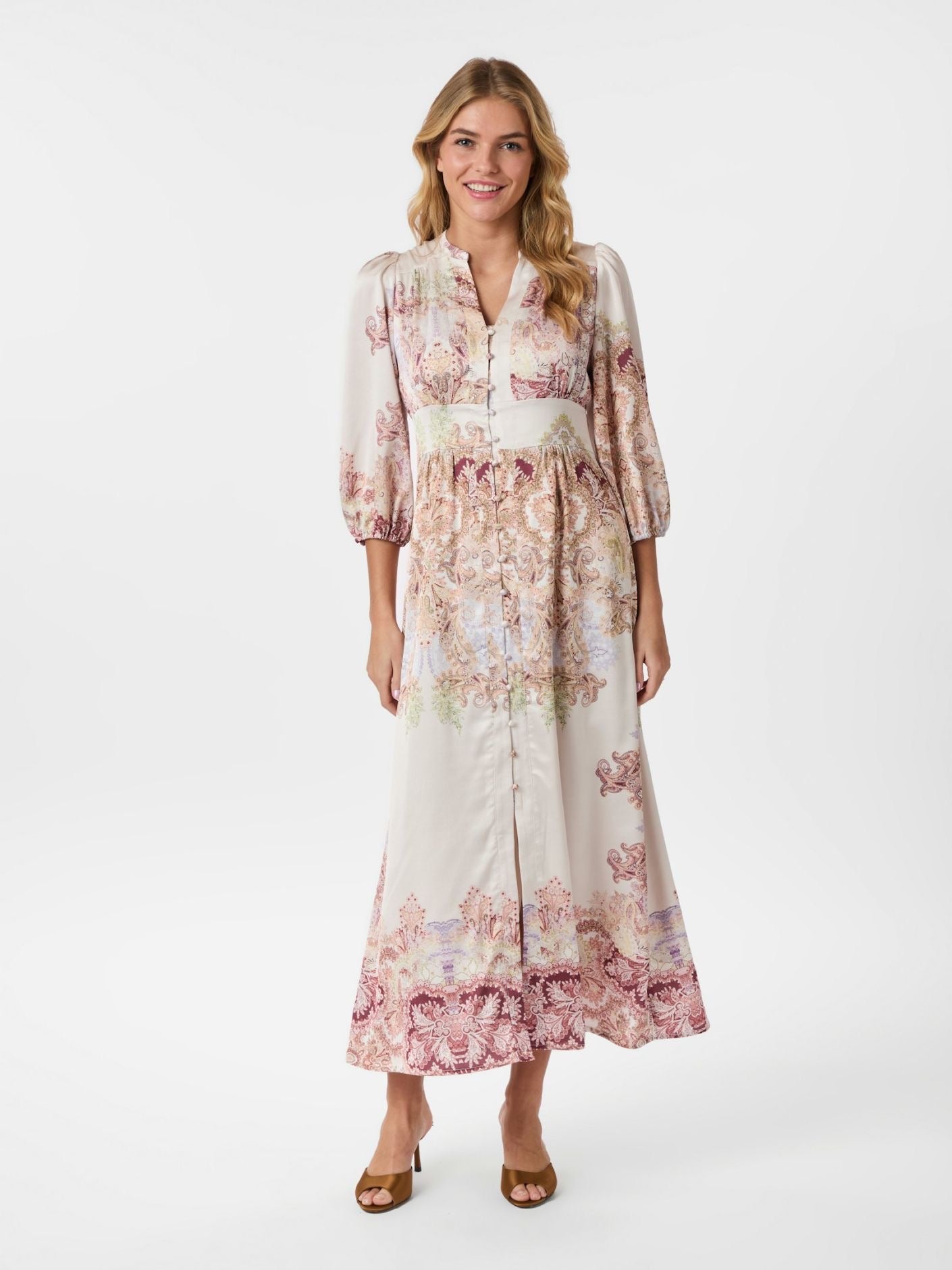 Vacker långklänning med paisleymönster. Klänningen har en V-ringning och knappar framtill, samt resår i midjan baktill. Modellen är 176 cm lång och bär storlek 36.