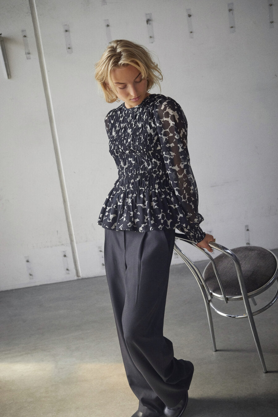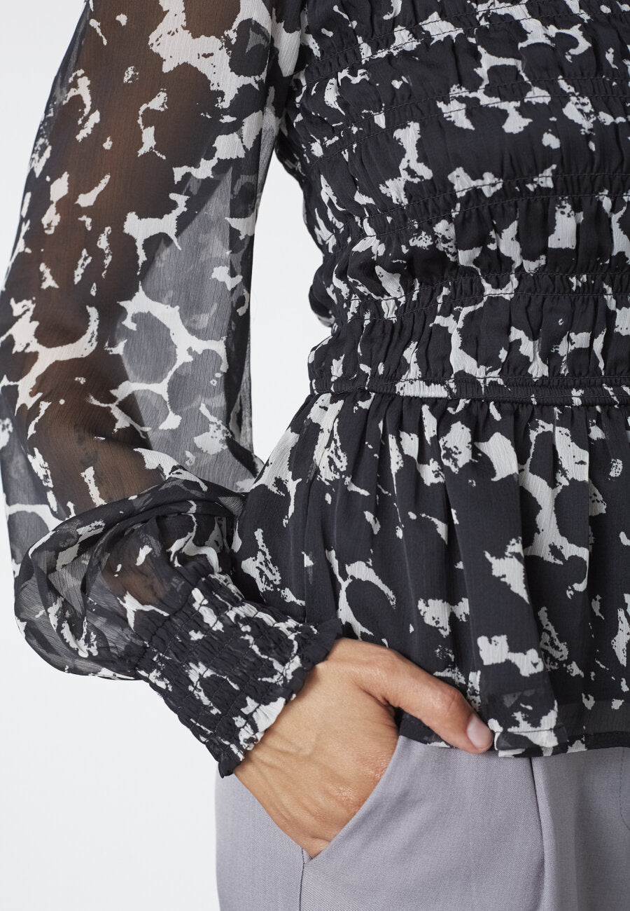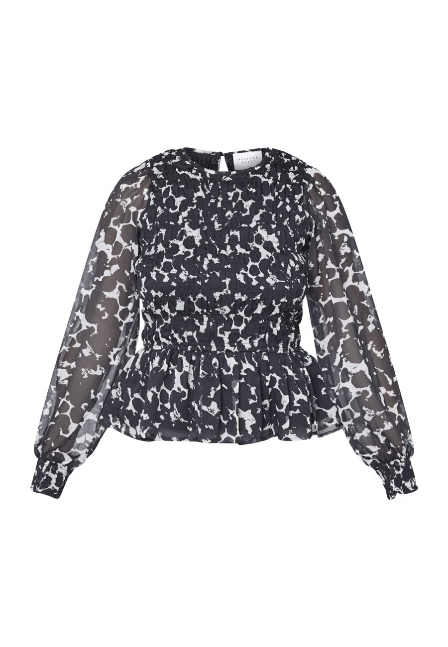 UDA är en transparent blus med smockeffekt framtill. Blusen har rund halsringning och långa ärmar som är rynkade vid axlarna.